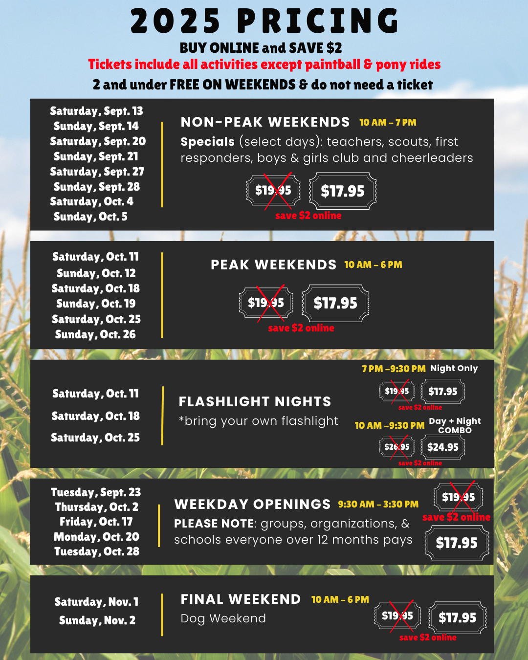 Experience our Corn Maze in the dark with only a flashlight. Most of our farmyard activities are also open. (our animals are not out at night) You can buy a Night Only ticket or a COMBO (day and night ticket) to attend Flashlight nights.